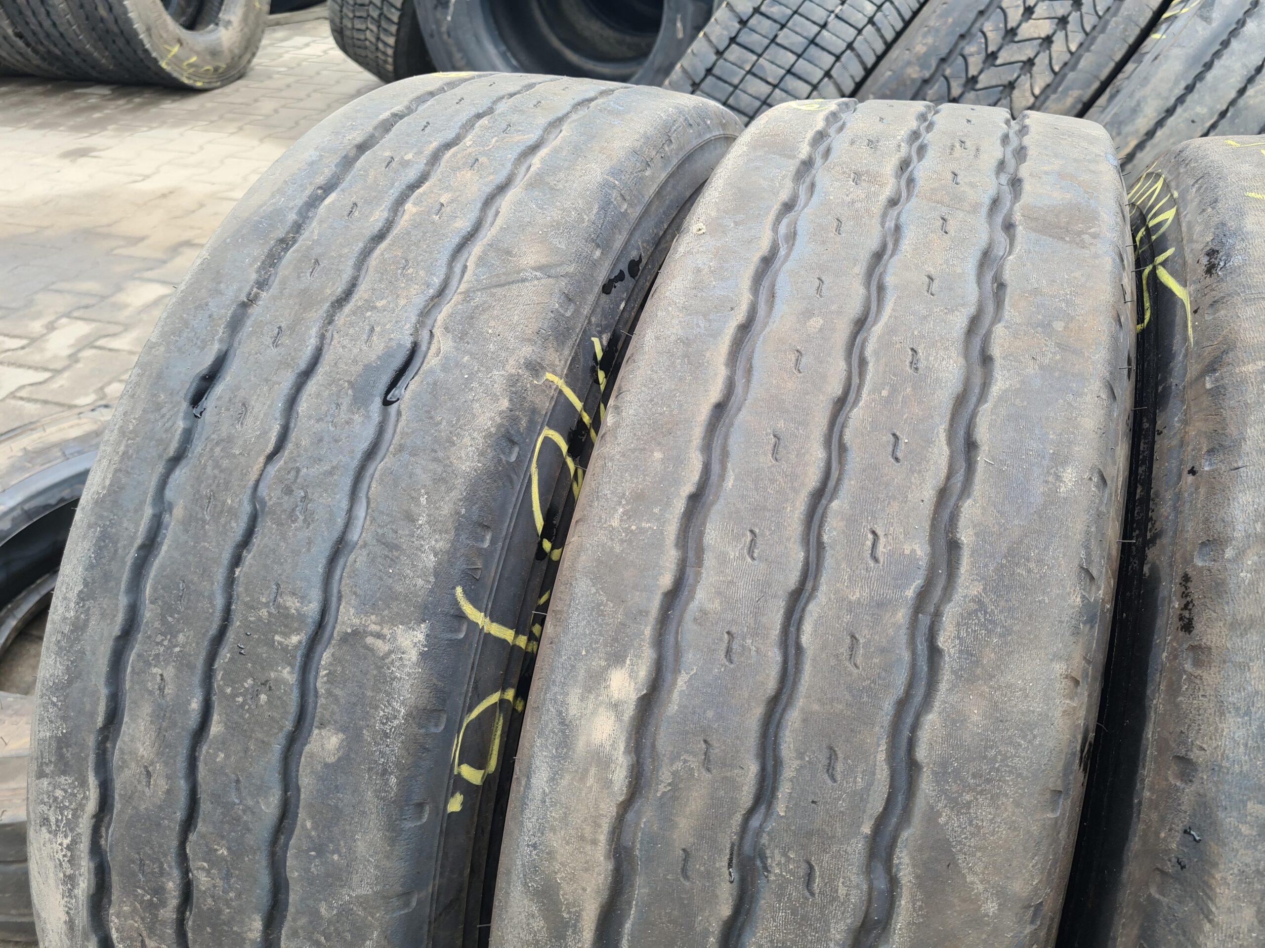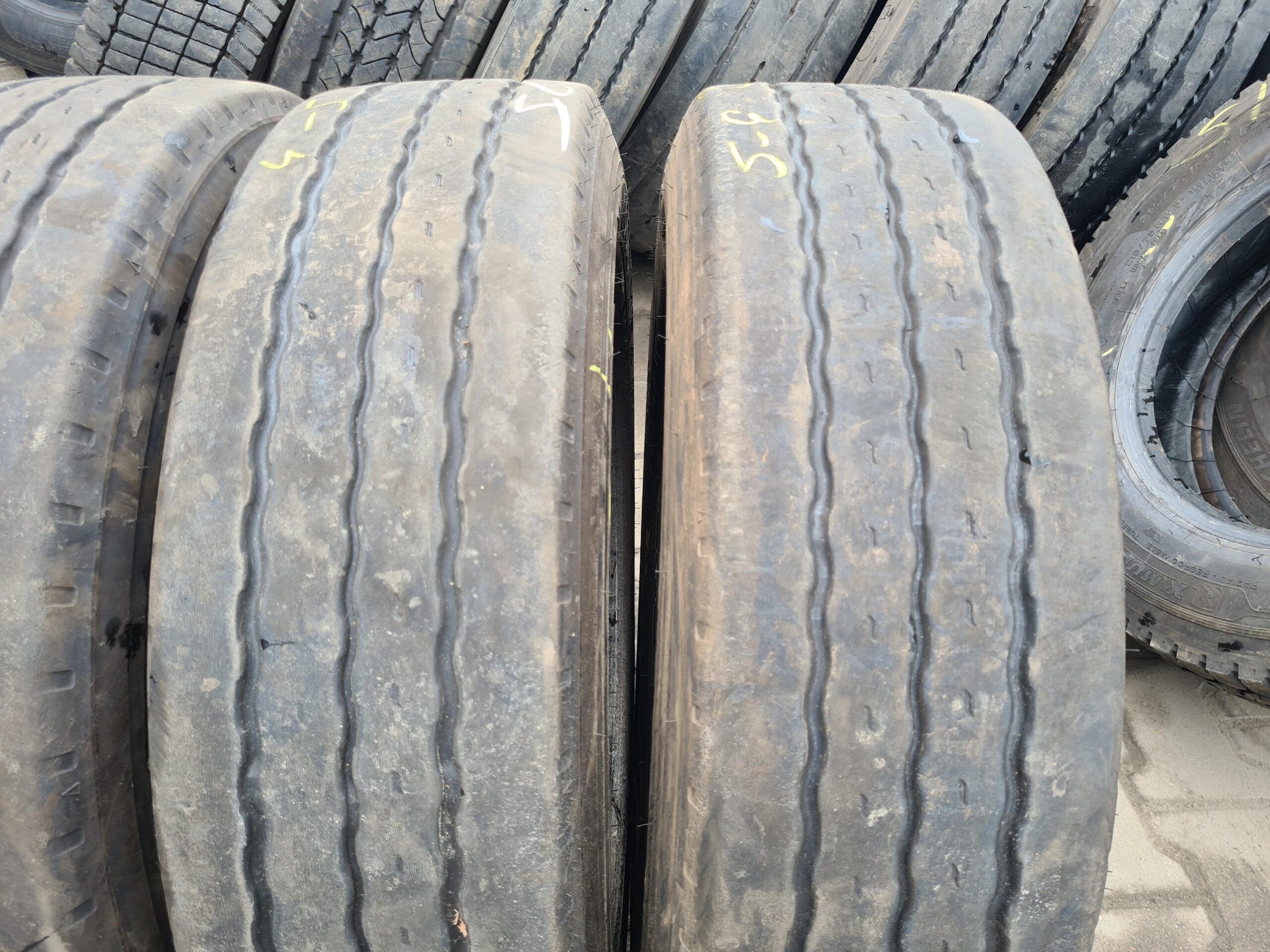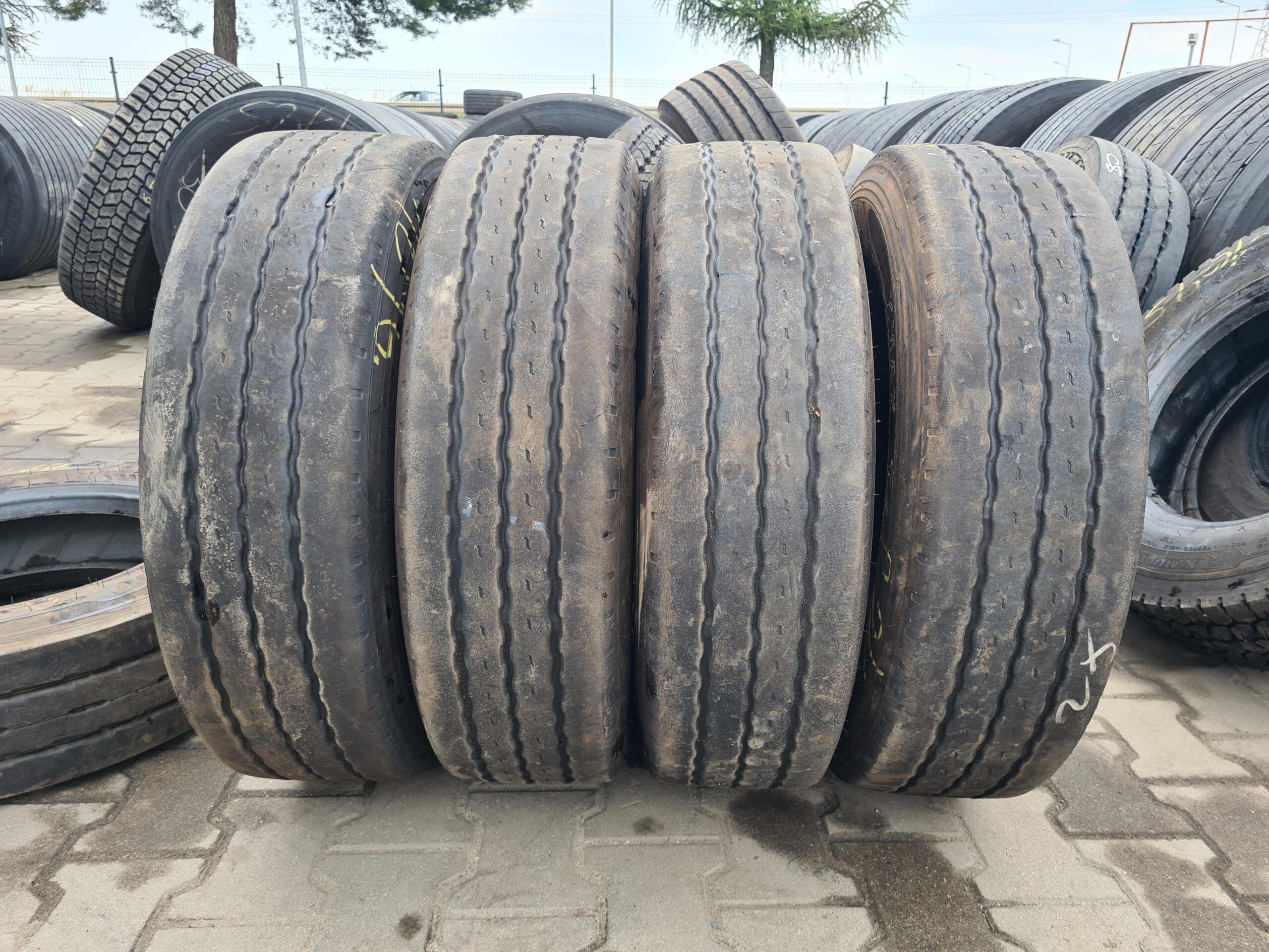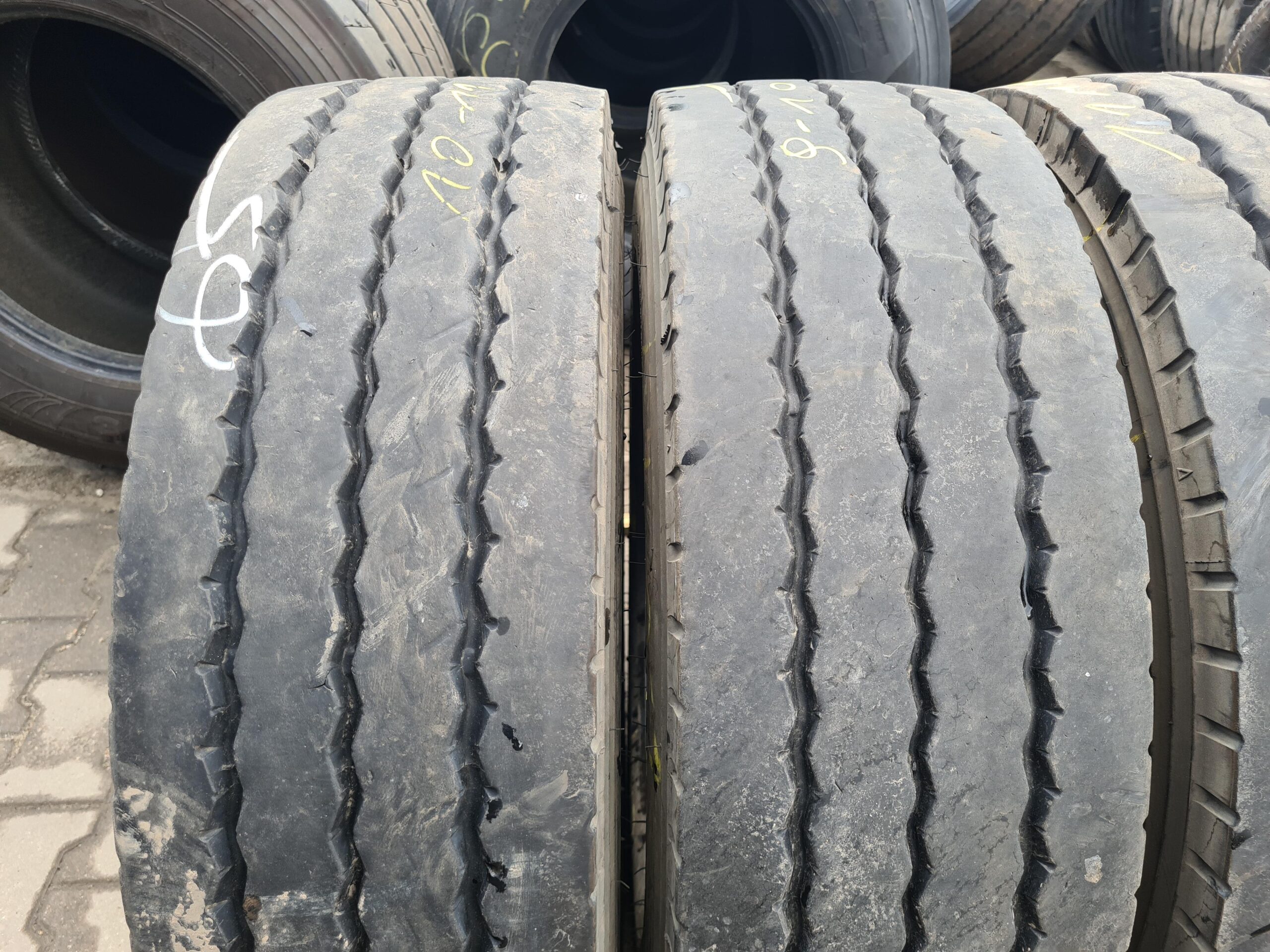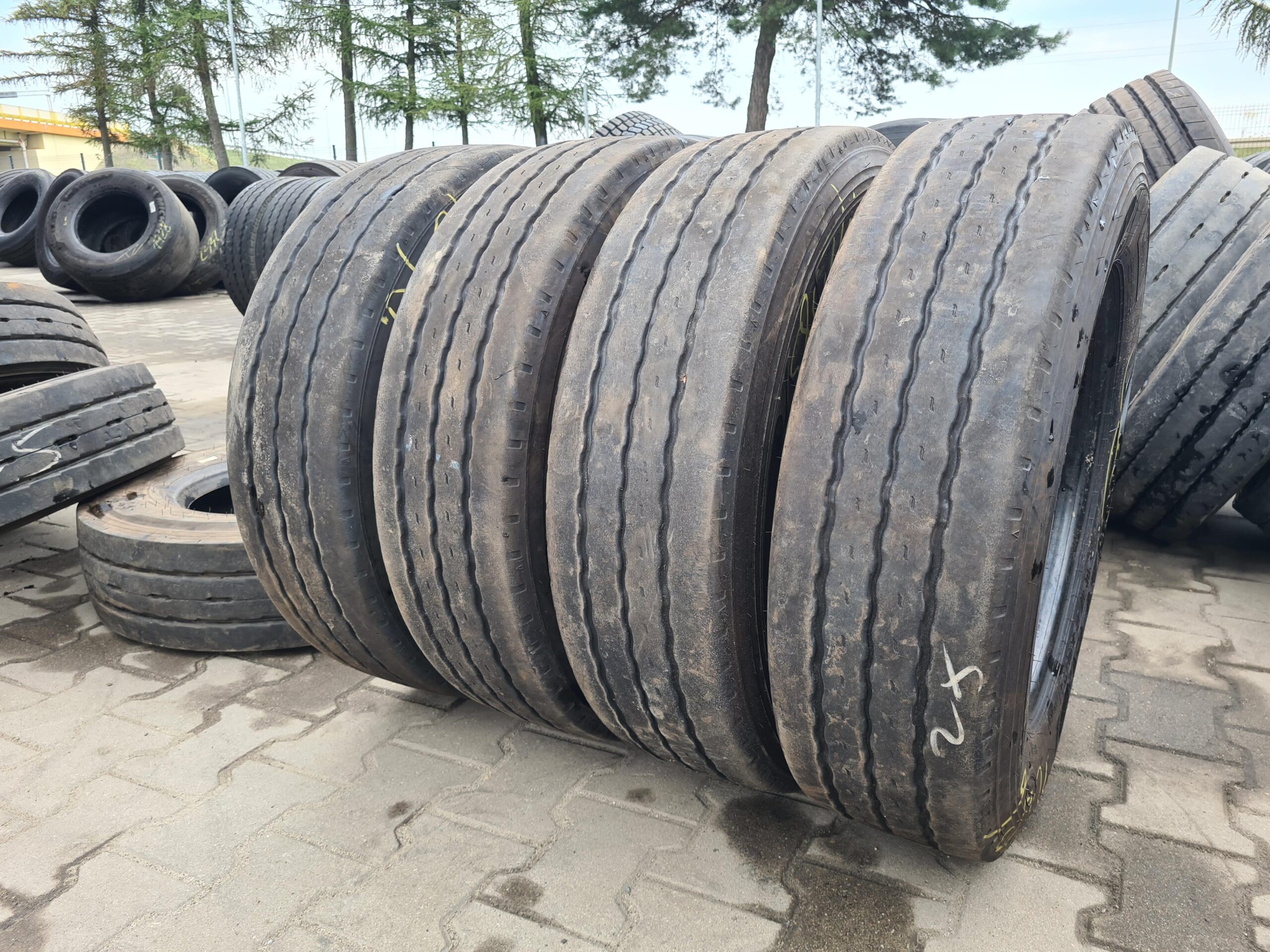 Stan bieżnika wynosi od 4 do 6 mm, co wskazuje na umiarkowane zużycie i możliwość dalszego użytkowania. Opony dostępne są w ilości czterech sztuk, co umożliwia ich zastosowanie w pojazdach wymagających wymiany opon na osi naczepowej. Produkt ten jest odpowiedni dla firm transportowych oraz użytkowników indywidualnych, którzy poszukują niezawodnych rozwiązań w zakresie opon do pojazdów ciężarowych.