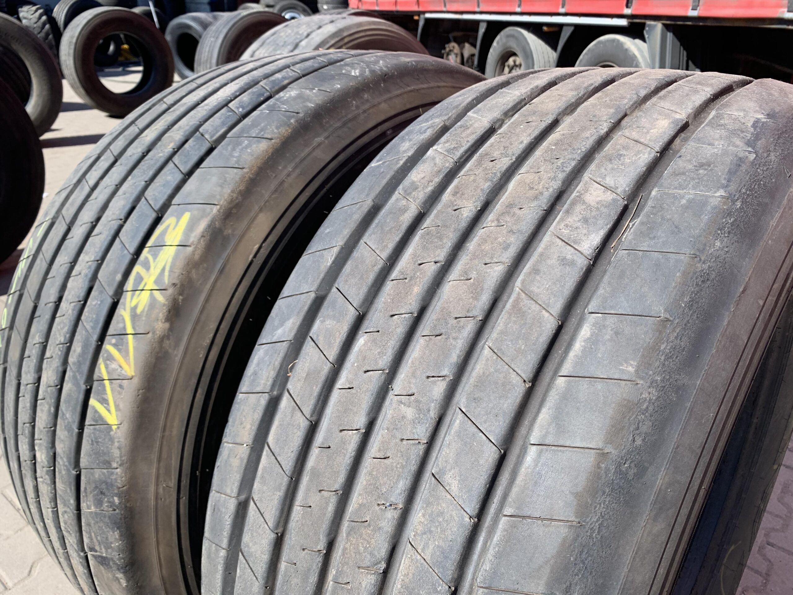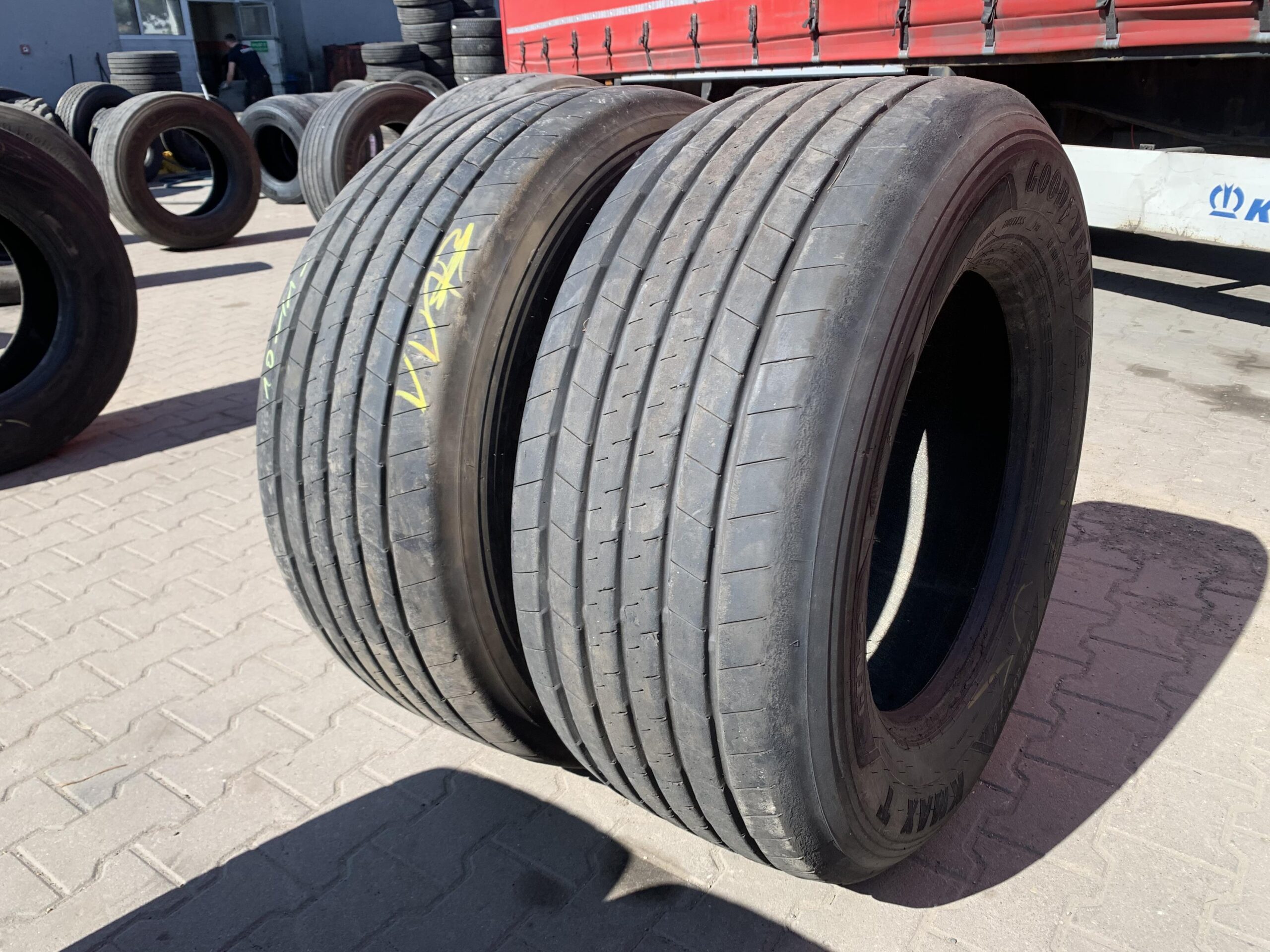 Opony ciężarowe 385/55R22.5 GOODYEAR KMAX T GEN-2 to produkt renomowanego producenta, przeznaczony do zastosowania na osi naczepowej. Opony te charakteryzują się rozmiarem 385/55R22.5 oraz bieżnikiem modelu KMAX T GEN-2, który został zaprojektowany z myślą o zwiększonej wydajności i trwałości. Stan bieżnika wynosi od 10 do 11 mm, co świadczy o jego dobrym stanie technicznym. Opony te są dostępne w ilości dwóch sztuk. Model KMAX T GEN-2 wyróżnia się optymalnym rozkładem nacisku na powierzchnię drogi, co przyczynia się do lepszej przyczepności oraz mniejszych oporów toczenia. Dzięki zastosowanej technologii, opony te zapewniają stabilność i bezpieczeństwo podczas transportu. Produkt ten jest odpowiedni dla firm transportowych poszukujących niezawodnych rozwiązań w zakresie opon do pojazdów ciężarowych.