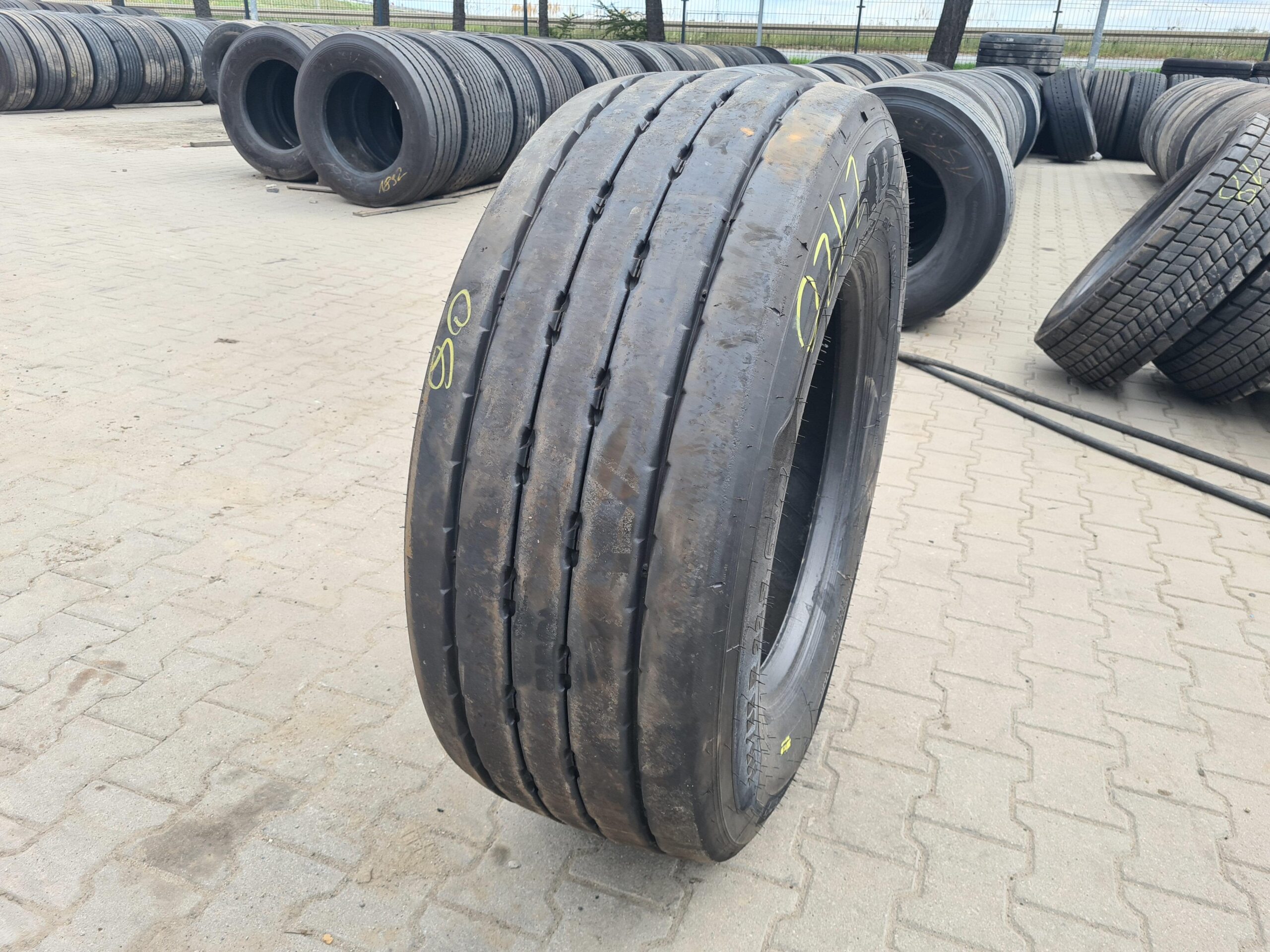Opony ciężarowe 385/55R22.5 MICHELIN X MULTI T2 EVOLUTION to produkt dedykowany do zastosowań na osiach naczepowych. Oferują one wysoką wydajność oraz stabilność podczas transportu, co jest istotne w kontekście przewozu towarów. Model X MULTI T2 EVOLUTION charakteryzuje się zaawansowanym wzorem bieżnika, który zapewnia optymalną przyczepność na różnych nawierzchniach, a także efektywne odprowadzanie wody, co wpływa na bezpieczeństwo jazdy w warunkach deszczowych. Opony te są zaprojektowane z myślą o długotrwałym użytkowaniu, co przekłada się na ich ekonomiczność. Stan opon jest widoczny na załączonych zdjęciach, co umożliwia ocenę ich kondycji przed zakupem. Produkt ten jest odpowiedni dla profesjonalnych przewoźników, którzy poszukują niezawodnych rozwiązań do swojej floty.