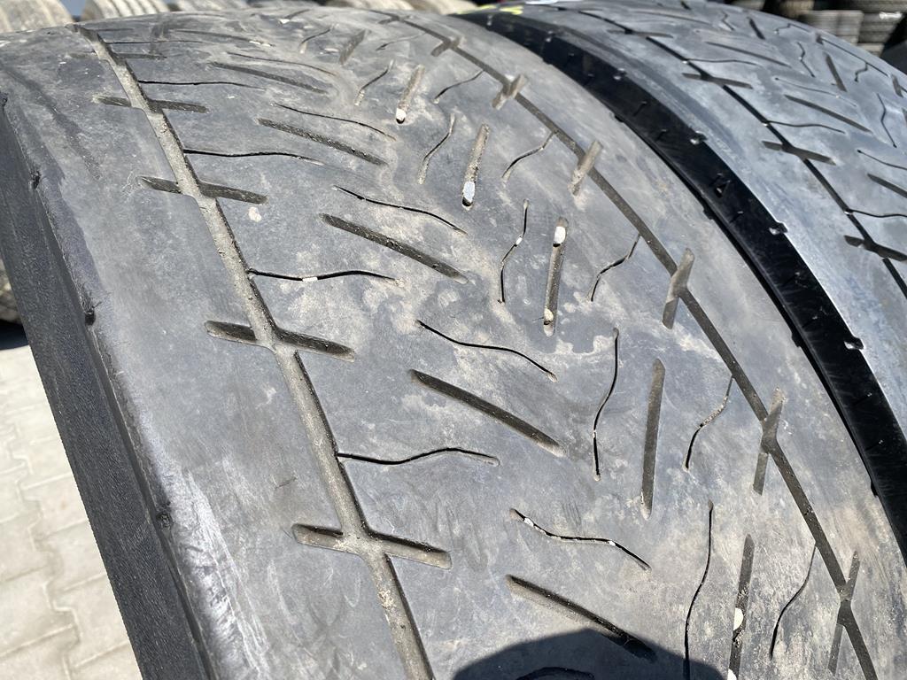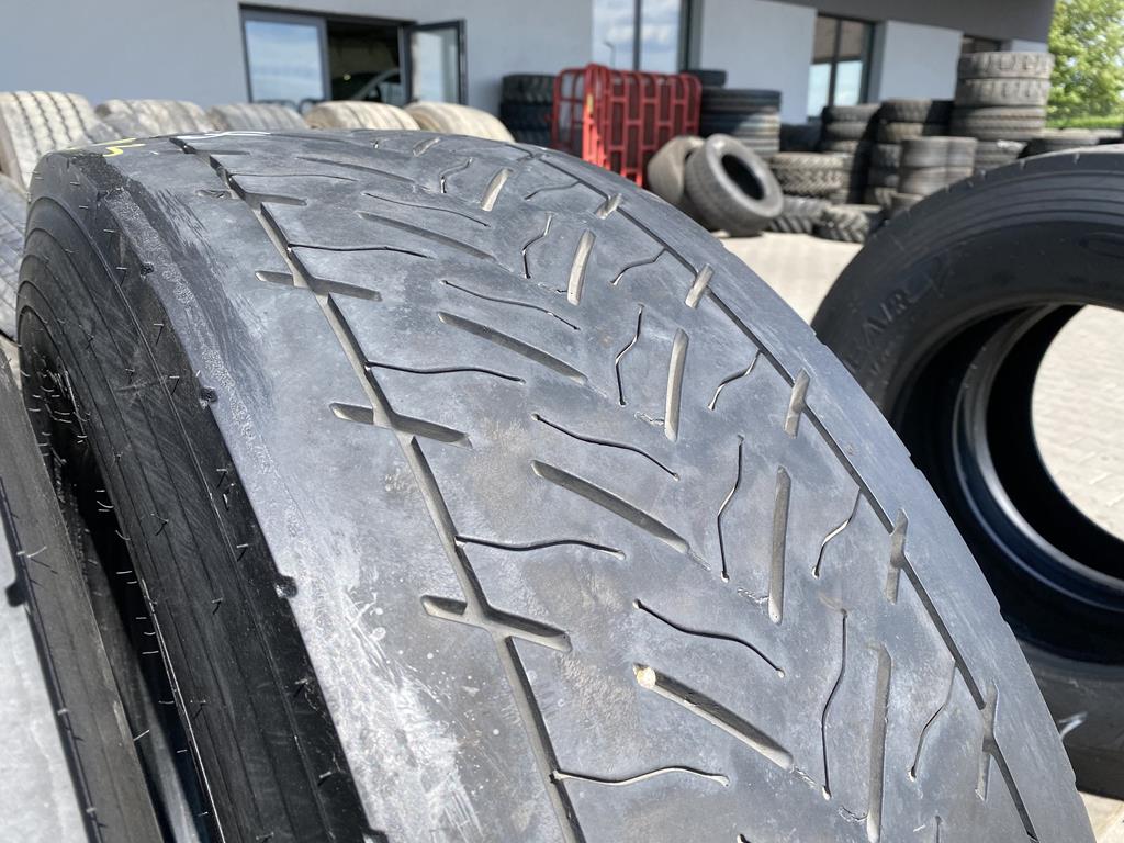 Prezentowana opona, w popularnym rozmiarze 315/70R22.5, zachowuje bieżnik wynoszący 8-9 mm. Taki stan wskazuje na to, że opona jest w kondycji umożliwiającej dalsze użytkowanie, oferując adekwatne parametry trakcyjne i wspierając bezpieczeństwo na drodze.