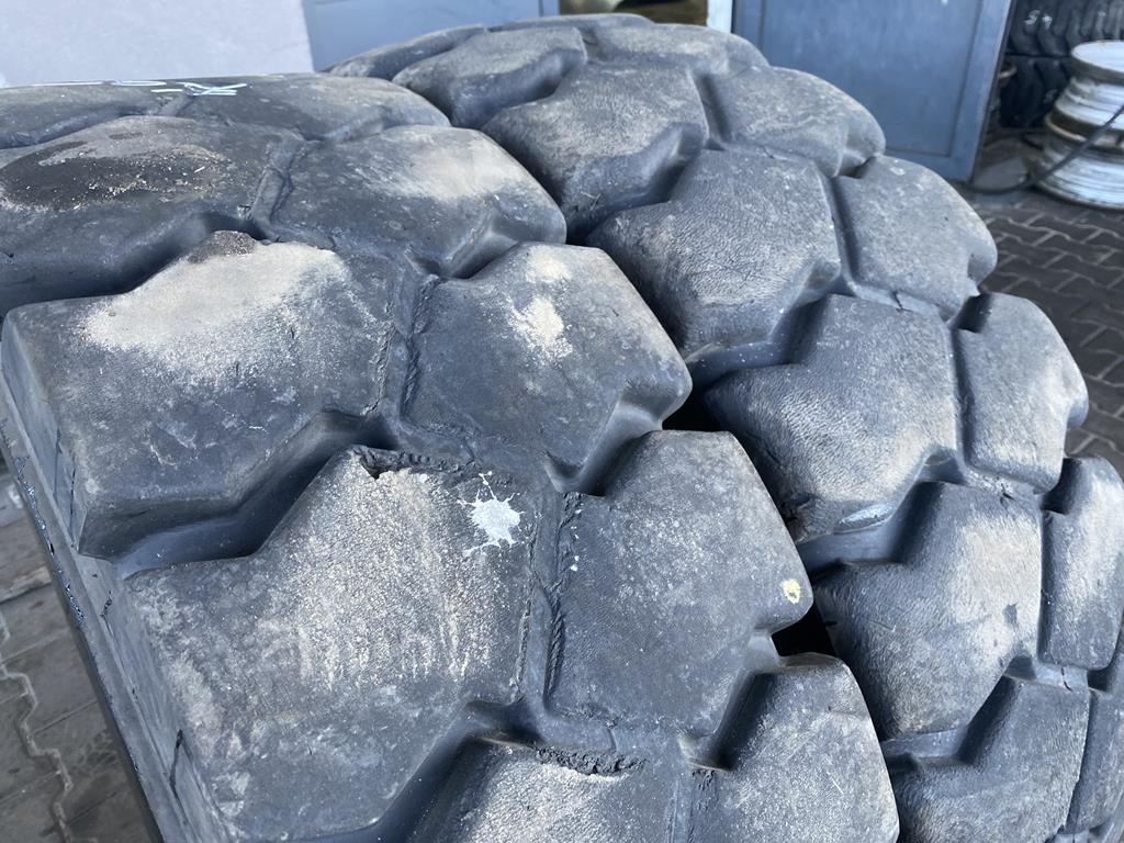 Stan bieżnika tych opon określono na około 50% jego pierwotnej głębokości. Taki stopień zużycia wskazuje, że opony przeszły znaczną część swojego cyklu eksploatacyjnego, jednak nadal posiadają użyteczny bieżnik do dalszej pracy w odpowiednich zastosowaniach przemysłowych, adekwatnych do ich obecnego stanu.