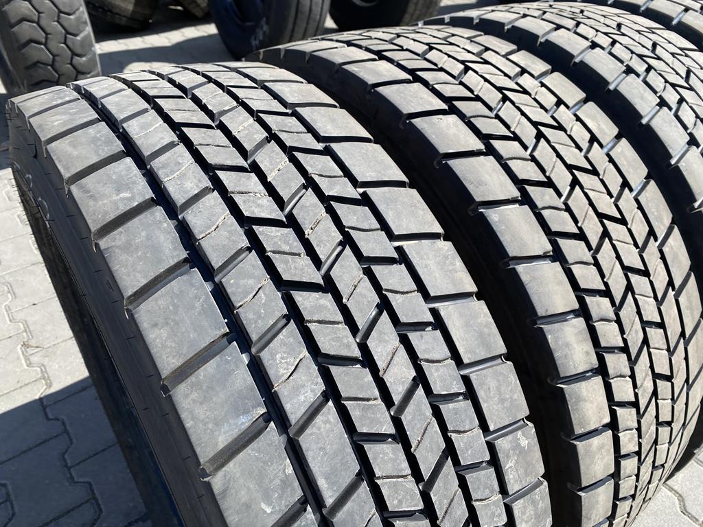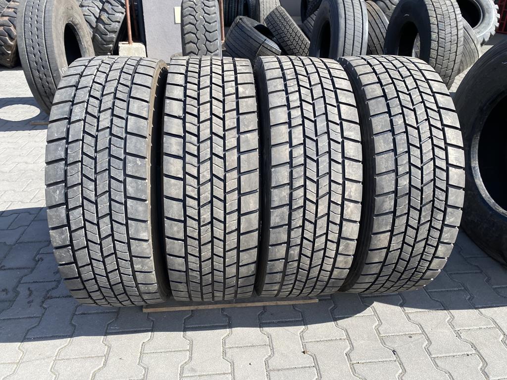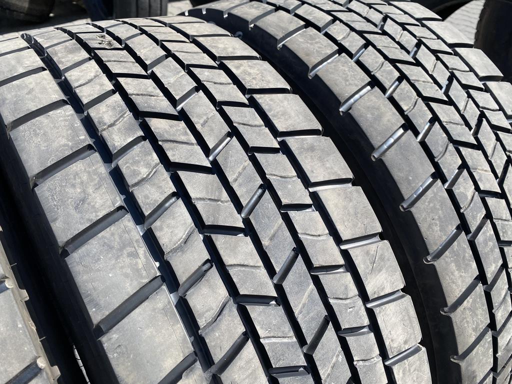 Opony są w rozmiarze 295/60R22.5. Ich cechą charakterystyczną jest pogłębiany bieżnik. Oznacza to, że po zużyciu części oryginalnej warstwy gumy, rowki bieżnika zostały nacięte głębiej zgodnie z technologią producenta, co pozwala na dalsze użytkowanie opony i wydłużenie jej żywotności. Stan ten wskazuje na zaawansowany etap eksploatacji, ale z możliwością dalszego wykorzystania dzięki zastosowanemu procesowi pogłębiania.
