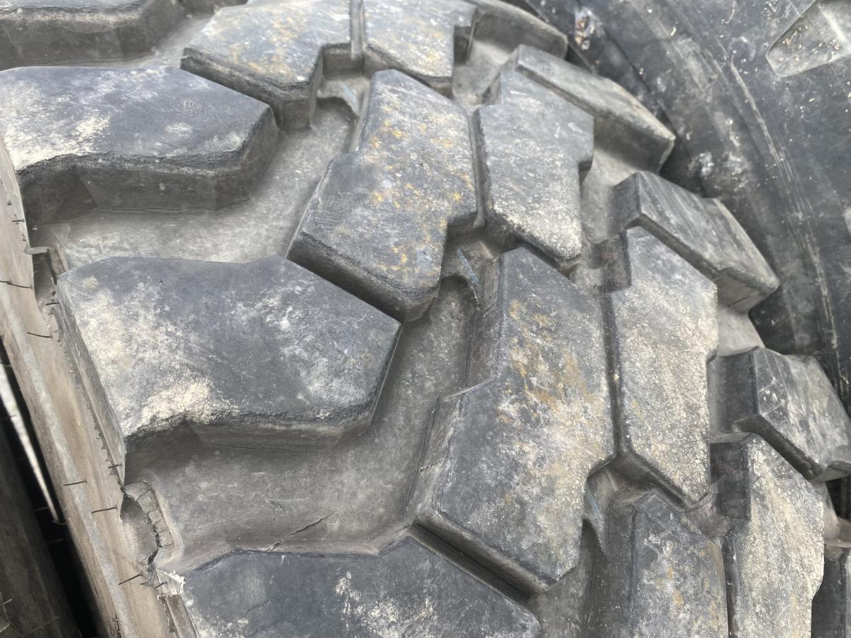 Każda z opon charakteryzuje się rozmiarem 395/85R20. Stan bieżnika tych egzemplarzy oceniany jest na około 90% jego pierwotnej wartości, co świadczy o ich bardzo dobrym zachowaniu i znacznym potencjale do dalszej, intensywnej eksploatacji w wymagających warunkach przemysłowych.